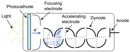 A schematic of a typical PMT, illustrating sequential processes, photoelectron ejection by a photoelectric effect, photoelectron acceleration for acceleration (dashed line), secondary electron emission at a dynode, the following cascading processes for multiple electrons generation/their acceleration, and their collection by an anode. Reproduced with permission from [71] (Applied Physics B: Lasers and Optics 2019).