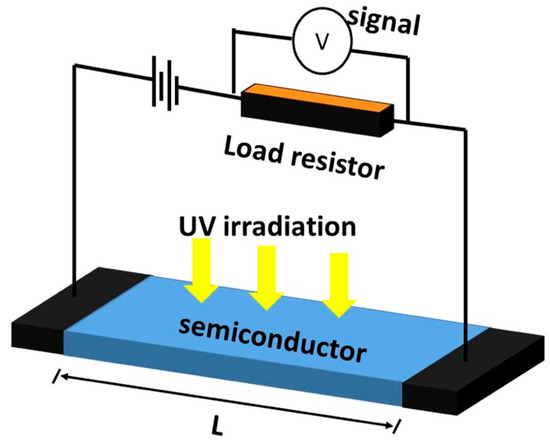 Very often, they have non-negligible internal gain for current, for which multiple carriers are collected at electrodes under a device neutrality, given a single pair of photogenerated electrons and holes, particularly when a photogenerated carrier’s lifetime is longer than a carrier transit time [90,91,92]. This eventually increases R and Id while decreasing the device bandwidth. As shown in Figure 6, a semiconductor material is connected between two metal electrodes under an external bias voltage. As photogenerated carriers are generated upon incident light absorption, external bias drives those carriers for current. For UV light detection, wide-bandgap semiconductors can be adopted between device electrodes as a medium where UV photon absorption takes place. This medium also plays a channel through which current flows, meaning its carrier mobility needs to be high for high device bandwidth. The media used for UV photon absorption in photoconductive detectors include ZnO [93], SiC [94], GaN [79], AlGaN [95], gallium oxide (Ga2O3) [96], Graphene [87], and Si [97].