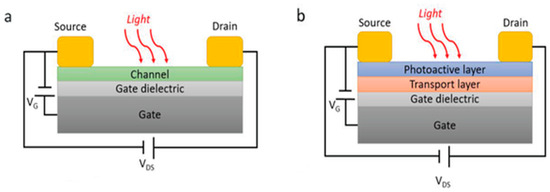 Field-effect transistors (FETs) have been used for photodetection via channel conductivity modulation by photogenerated carriers [99]. As shown in Figure 7, its structure typically comprises source, drain, gate, photon-absorbing media (which could also be the same as the channel itself), an oxide dielectric layer (e.g., SiO2 or Al2O3), a channel, and a substrate. Like the role of a gate bias voltage that changes channel conductivity, incident photons can act as a photogate [100]: one type of photogenerated carriers can be trapped in an absorber (in cases of small dimensions such as a quantum dot), near the absorber–channel interface, or channel–dielectric interface. Then, trapped carriers can produce local electric fields as extra gate fields, therefore strongly affecting the gate voltage threshold in FET performance. This eventually enables great change in conductivity to be achieved. Photogenerated carriers themselves in a channel can also contribute to photoconductivity change. FET-based photodetectors take advantage of ultrahigh responsivity, dark current suppression, low power consumption, and compatibility with CMOS processes for integrated chips [101], while facing the challenge of limited bandwidth and degradation issues, particularly in hybrid structures, such as with perovskite and quantum dots [102,103,104].