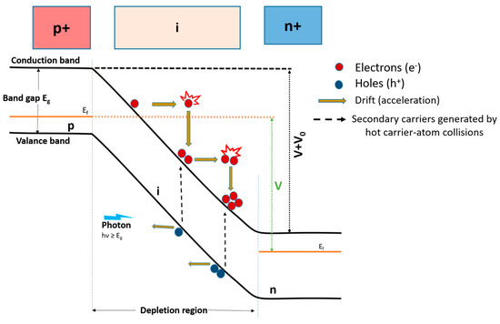 An avalanche photodiode (APD) utilizes an avalanche effect for which a reverse bias voltage is adjusted to be close to or beyond the breakdown voltage, i.e., tens to hundreds of volts. This high electric field that adds up to the inherent junction field accelerates photogenerated carriers in the junction (carrier depletion) of p-n/p-i-n structure semiconductors, kicking them into (unthermalized) hot carriers with enormous kinetic energies. They collide with lattice atoms, knocking their bound electrons into a conduction band (creating additional free electrons) while generating holes in a valence band. Those additional carriers are again accelerated and undergo similar procedures, giving rise to carrier multiplication in a cascading process, as shown in Figure 8. This avalanche effect leads to an ultrahigh gain of about 10–100 for current, with a consequence of ultrahigh R, making the device suited for low-light detection. However, the random characteristics of impact ionization by electron–atom collision produce excess noise as the trade-off for very high gain. Avalanche photodiodes can be operated either in a linear mode or Geiger mode, depending on the external bias magnitude (smaller or greater than a breakdown voltage). SiC is one of the widely used semiconductors as an absorbing medium for UV light APD due to its wide bandgap energy (3.2 eV) and high breakdown voltage (100–400 V for a thin junction, while more than 1 kV for a thick junction) [106,107]. AlGaN and GaN can also be used as a UV light-absorbing medium with additional benefits due to their good solar blindness [108,109]. Si can also be used as an absorbing medium due to its high absorption coefficient at the UV light spectral wavelengths, as mentioned above. However, the very short penetration depth of UV light into Si hinders it from being used as a deep-UV light-absorbing medium due to its surface trap-mediated recombination of photogenerated carriers. Instead, Si-based APD has found application in APD for near-UV light detection [110,111].