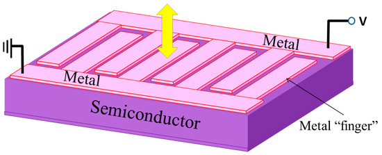 Wide-bandgap semiconductors are often utilized in “metal-semiconductor-metal (MSM) photodiodes with interdigitated electrodes. They have gained popularity for UV light detection due to their high bandwidth, low dark current, easy fabrication (standard microfabrication techniques), and monolithic integrability with other electronic devices. Interdigitated electrodes of gold or platinum can be patterned like interlaced fingers on a semiconductor (light-absorbing medium), as shown in Figure 9. The metal–semiconductor interface in the MSM structure forms back-to-back Schottky barriers whose height can be modulated by externally applied bias voltage. Interdigitated electrode structures enable the electric fields between electrodes to be homogeneous while the carrier transit time between them would be short, being beneficial for high bandwidth (fast response). An interdigitated electrode structure can also be optimized for dark current suppression and capacitance minimization. As the semiconductors for UV light absorption, GaN [126], AlGaN [127], ZnO [128], SiC [129], and diamond are used [130]. There could be carrier-trapped states at the metal–semiconductor interface affecting Id and the effective bias voltage due to additional local static fields from trapped carriers.