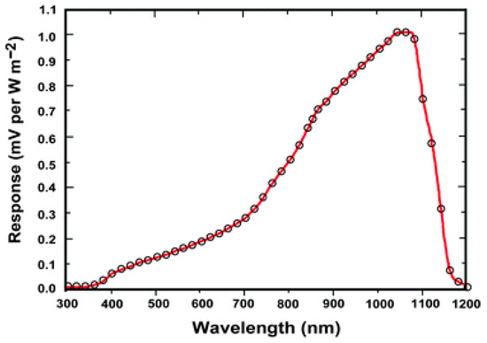 Spectral response curve (Responsivity R versus wavelength) of Si used in solar cells under solar radiation. R drops rapidly at above 1100 nm due to the cutoff given by bandgap energy of 1.12 eV. Reproduced with permission from [153] (Chemical Society Reviews 2013).
