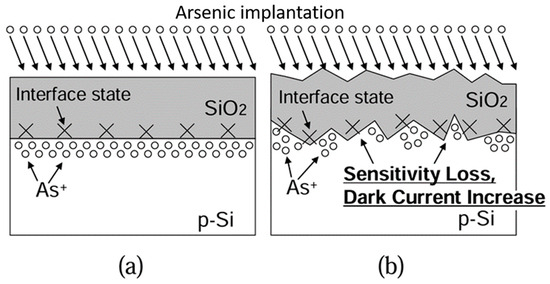 - Kuroda, R.; Nakazawa, T.; Hanzawa, K.; Sugawa, S. Highly ultraviolet light sensitive and highly reliable photodiode with atomically flat Si surface. In Proceedings of the International Image Sensor Workshop, Nanae, Japan, 8–11 June 2011; pp. 38–41. [Google Scholar]