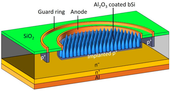 - Setälä, O.E.; Chen, K.; Pasanen, T.P.; Liu, X.; Radfar, B.; Vähänissi, V.; Savin, H. Boron-Implanted Black Silicon Photodiode with Close-to-Ideal Responsivity from 200 to 1000 nm. ACS Photonics 2023, 10, 1735–1741. [Google Scholar] [CrossRef] [PubMed]