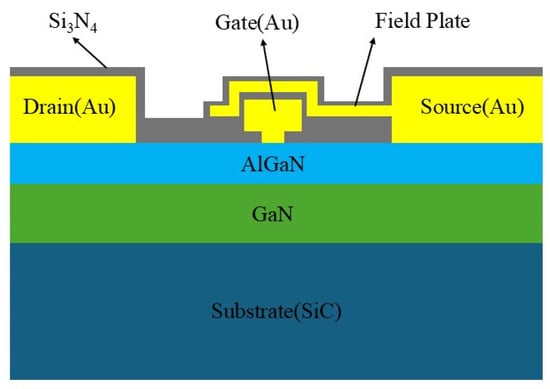 We selected a batch of GaN HEMTs with identical structures, the cross-sectional schematic of which is shown in Figure 1. The device is fabricated on a SiC substrate, followed by the sequential growth of a GaN buffer layer, an AlGaN barrier layer, and a passivation layer. A two-dimensional electron gas (2DEG) is formed at the AlGaN/GaN heterojunction interface. The gate is a Schottky contact, while the source and drain are Ohmic contacts. The field plate located near the gate is tied to the source terminal, redirecting the feedback capacitance from the gate–drain path to the gate–source path, which reduces the device gain drop. All gold-based metal electrodes are covered by a silicon nitride (Si3N4) thin film. The specific structural parameters of the device are listed in Table 1. In this work, the drain voltage was set at 10 V, and the gate voltage was set at –2.3 V, corresponding to a typical drain current of 100 mA. The typical operating frequency range is 2–6 GHz, with a small-signal gain of approximately 24 dB and a noise figure as low as 1.5 dB. To ensure statistical reliability, ten devices from the same batch with excellent initial parameter consistency were selected for reliability testing. All tested devices exhibited similar degradation and failure phenomena. From the resulting dataset, the device whose performance was closest to the median was chosen for detailed analysis.