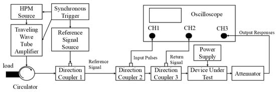 Figure 2 presents the schematic diagram of the measurement system used to investigate the failure mechanisms of GaN HEMTs under HPM pulse injection. The measurement system consists of an HPM signal source, a driver amplifier, a circulator, a power supply, the HEMT under test, a directional coupler, an attenuator, a vector network analyzer, an oscilloscope, and a power meter. Experimental methods for investigating high-power microwave (HPM) effects generally include irradiation and injection approaches [14]. In this study, the injection method was employed, in which microwave pulses were directly injected into the HEMT through a transmission cable. During the measurement process, a series of pulses generated by the HPM source were gradually amplified by a solid-state power amplifier, then injected into the device under test (DUT) via a circulator and cascaded directional couplers. The output signals were subsequently routed through a directional coupler and an attenuator into a spectrum analyzer to monitor the output in the frequency domain. The coupled ports of directional couplers 1, 2, and 3 were used to monitor the injected pulse power threshold, reflected signals, and output signal waveforms, respectively. Attenuators were employed to protect the oscilloscope.