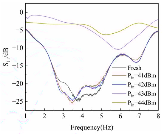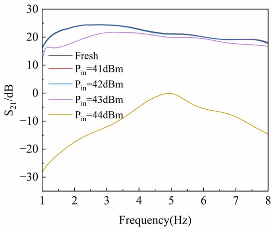 The preliminary tests were conducted to measure the RF characteristics of the GaN HEMT devices. During the initial stage, high-power microwave pulses with power levels of 41 dBm, 42 dBm, 43 dBm, and 44 dBm were injected. The HPM pulses had a frequency of 3.5 GHz, a pulse width of 30 ns, rise and fall times of 18 ns, a period of 2 ms, and a total of 200 pulse cycles. The gate voltage was set to −2.3 V, and the drain voltage was at 10 V. Figure 3 and Figure 4 show variation in the device reflection coefficient (S11) and gain coefficient (S21) as a function of input power. As observed in Figure 3, the reflection coefficient of the GaN HEMT exhibits an abrupt change around 43 dBm, and Figure 4 shows that the gain of the device also undergoes a sudden shift at this point. Therefore, a power level 0.5 dBm below the damage threshold was selected to ensure that the device would not fail instantaneously.