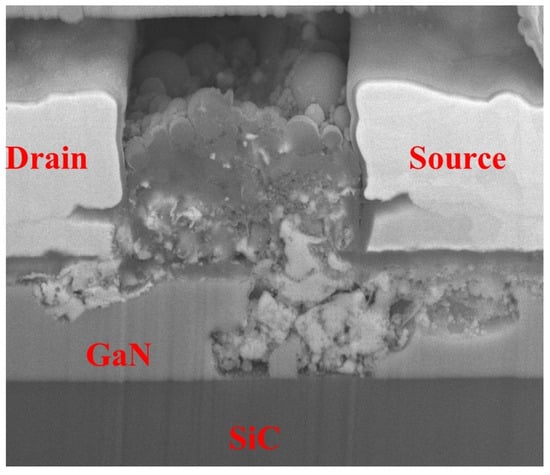 The DUT was subjected to HPM pulses with an injection power of 42.5 dBm, a frequency of 3.5 GHz, a pulse width of 66 ns, and a period of 2 ms, with the gate voltage set to −2.3 V, and the source–drain voltage set to 10 V. After sequentially injecting 10, 20, 50, 80, 100, 200, 500, and 800 pulses, the device remained intact. When the injection power was increased to 43 dBm, the device failed after 10 pulses. To characterize the failure, the damaged region was analyzed using FIB cross-sectioning. The morphology of the burnout cross-section is shown in Figure 5, from which severe damage to the gate can be observed. The preliminary assumption is that the failure mechanism may be attributed to defect accumulation during the first 800 pulses and/or sudden breakdown under the 43 dBm stress [15].