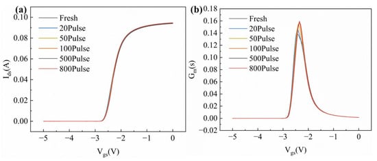 Figure 7 shows the output characteristics of the device before and after HPM pulse injection. The drain–source voltage ranged from 0 to 10 V, and the gate–source voltage ranged from −2 V to −3 V in steps of 0.25 V. The device’s saturation current exhibits a decreasing trend, dropping from 0.208 A to 0.179 A after HPM stress. However, once the cumulative number of injected pulses reaches 500, the saturation current density no longer decreases, indicating that further accumulation of pulses does not lead to additional degradation of the device’s electrical characteristics. The drain–source current collapse observed in fresh GaN HEMTs is primarily linked to the virtual gate effect, where a high drain bias near cutoff causes electrons to become trapped in a defect located at the AlGaN surface and within the barrier near the gate [17]. Studies have shown that positively charged centers generated by the ionization of donor-like defects near the gate are the primary cause of the virtual gate effect, which in turn leads to the degradation of the gate controllability of the device [18]. HPM injection may passivate some of these donor-like defects near the gate, and the reduction in defect concentration at the AlGaN surface near the gate leads to an increase in device transconductance [16]. The 2DEG concentration in GaN HEMTs is also closely related to the concentration of donor-like surface defects on AlGaN [18]. A reduction in these surface defects can indirectly lead to a decrease in the device’s saturation drain current density.