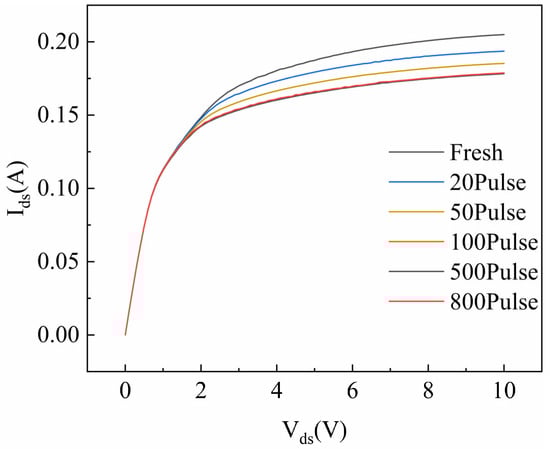 To reveal the impact of HPM pulses on the DC characteristics of GaN HEMT devices, the transfer characteristics (Ids–Vgs) and output characteristics (Ids–Vds) of the GaN HEMT were measured before and after the experiments. Figure 6a,b show the transfer characteristics and transconductance curves of the device before and after HPM stress, respectively. During the measurements, the drain voltage was set to a constant 0.5 V, and the gate voltage was swept from −5 V to 0 V in increments of 0.05 V. Both the transfer and transconductance (Gm) curves exhibited slight rightward shifts, with the threshold voltage (Vth) drifting from −2.61 V to −2.56 V. This small shift does not significantly affect the electrical characteristics of the device. The Gm of the device initially increased with the cumulative number of injected pulses and then gradually saturated, indicating an enhancement of the gate control capability. The enhancement of gate control is generally attributed to the reduction in defect density near the gate [16].