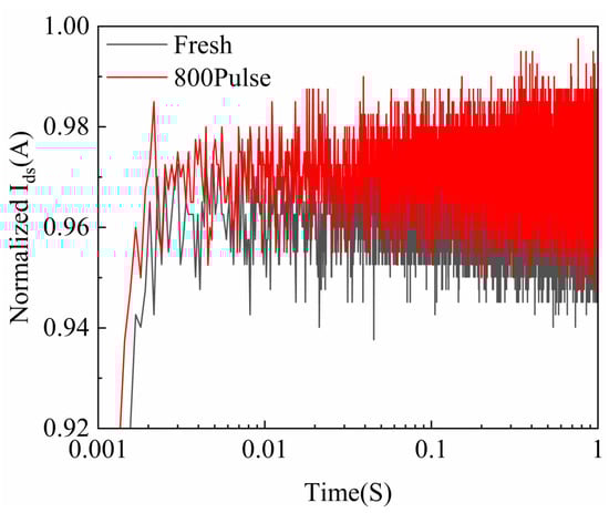 The gate-lag characteristics are an important method for characterizing defects near the gate region of GaN HEMTs. Figure 8 shows the gate-lag curves of GaN HEMTs before and after HPM stress. The test conditions for these measurements are as follows: First, under the condition of Vgs = −5 V and Vds = 0 V, the device was maintained in the OFF state for 100 s. Subsequently, the gate voltage was switched to 0 V, thereby driving the device from the OFF state to the ON state. The drain current transient was recorded for 1 s after the gate bias was switched. For the fresh device, an electric field directed from the drain to the gate is formed as the negative voltage is applied to the gate, causing electrons to be trapped by original defects within the AlGaN layer or at the interface [19]. These occupied defects are typically situated near the drain, close to the gate, leading to depletion of the 2DEG in these regions. When the negative gate voltage is removed, the trapped electrons are not immediately released and require some time to recover [20]. After the device undergoes HPM stress, it reaches a steady state more quickly, indicating a reduction in defect concentration near the gate. This suggests that the accumulation of extremely low-duty-cycle HPM pulses does not lead to defect buildup that would cause device failure [21].