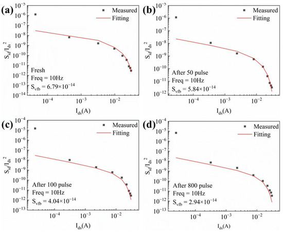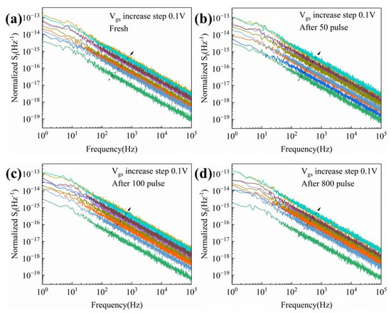 LFN measurements have been demonstrated to be an effective technique for characterizing channel defects and interface state density. To further investigate the impact of HPM stress on GaN HEMTs, LFN spectra were measured under various gate bias conditions. The drain bias was fixed at 0.1 V, and the noise density (SI) was measured as a function of frequency while the gate voltage was swept from −2.8 V to −2 V in steps of 0.1 V. Figure 9a presents the original SI versus frequency curve, while Figure 9b–d show SI versus frequency after 50, 100, and 800 cumulative injected pulses, respectively.