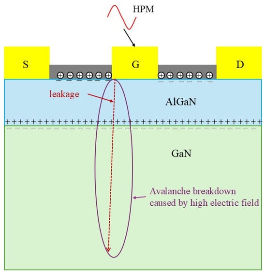 Gallium nitride (GaN) high-electron-mobility transistors (HEMTs), featuring high breakdown field strength, high channel carrier density, and high drift velocity, are representative wide-bandgap power semiconductor devices that have been widely applied in power electronics and radio frequency fields [1,2,3]. With the increase in power density, GaN HEMT devices also need to deal with increasingly complex electromagnetic environments such as high-power microwaves (HPMs), high-power electromagnetic pulses (EMPs), and particle irradiation. Reliability problems have become one of the biggest obstacles to market competitiveness. HPM pulses can be coupled into the radio frequency (RF) front end through the front door (antenna) and the back door (microstrip line or power line) [4,5]. As a key component of the RF front-end receiving chain, the foremost HEMT is the part most susceptible to damage. Therefore, it is necessary to investigate the damage effects of HPM on GaN HEMT devices [6,7,8].