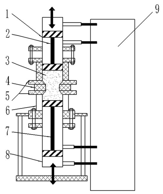 Equipment and schematic diagram. 1—Piston Cylinder; 2—Piston; 3—Abrasive Medium; 4—Workpiece to Be Processed; 5—Fixture; 6—Abrasive Cylinder; 7—Piston; 8—Piston Cylinder; 9—Hydraulic System.