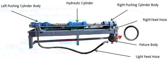 The experimental subject is a main bearing ring made of 8Cr4Mo4V material, with a hardness of HRC61. The dimensions of the bearing ring are D × d1 × d2 × B = 200 mm × 186 mm × 178 mm × 35 mm. The surface roughness Ra of the raceway is 0.32 μm, while the surface roughness Ra of the oil holes is 2.198 μm. A self-developed MLL250 horizontal abrasive flow polishing machine is used as the abrasive flow polishing experimental platform, as shown in Figure 2. Customized fixtures designed for the main bearing ring and self-formulated viscoelastic cubic boron nitride abrasives with particle sizes of 10,000 and 18,000 mesh are used for processing the raceway. Considering the small diameter of the oil holes, coarser abrasives could lead to hole enlargement; therefore, 5000-mesh viscoelastic cubic boron nitride abrasives are chosen for oil hole processing.