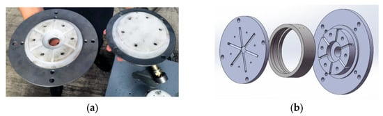 During the abrasive flow machining process, it is essential to design a suitable fixture to ensure that the abrasives are guided by the medium flow channel restrictor to compress the processed area, while other parts of the bearing ring raceway will not be influenced. In this study, a single fixture was chosen to accomplish the machining tasks for both the oil holes and the raceway of the aircraft engine main bearing ring. Given that the roughness requirement for the oil holes is lower than that for the raceway, the designed fixture maintains a gap about 2–3 mm between itself and the main bearing ring to ensure the effectiveness and precision of the machining process [24]. The design of the fixture is shown in Figure 3.