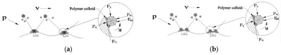 The mechanism of abrasive flow machining operates by applying compressive forces to a fluid medium that contains abrasives and possesses properties as viscoelastic, soft, and cutting properties, forming a semi-solid yet flowable “extrusion block”. This block is then made to flow rapidly and reciprocally over the surface to be machined, performing micro-cutting on the work-piece surface through a process known as “dynamic micro-edge cutting”. Through the complement of the cycle of “extrusion—slip—shear”, metallic material can be removed. A further analysis of the extrusion process reveals that during the flow through the channel, the abrasive particles encapsulated in the high-elasticity colloid serve as the working medium. The extrusion process can be viewed as the work performed by the expansion of the elastic medium, as illustrated in Figure 5. Under the influence of the deformed high-elasticity abrasives, the deformation of the medium experiences a cycle of “gradually increasing—maintaining—then returning to the original state”. Compared to inelastic abrasive media, this process allows for a prolonged time during which the abrasives expand and perform work. In comparison to the ”inelastic” sliding machining time t1, the “elastic” sliding time t2 with viscoelastic abrasives involved in the cutting is greater, specifically t2 > t1. As the time increases, so does the cutting distance, and thus the efficiency of the abrasive “micro-edge” cutting is enhanced. That is to say, under the influence of the high-elasticity colloid, the duration during which the abrasives remain adhered to the machined surface is prolonged, effectively extending the plowing phase, thus stabilizing the “cutting” effect of the same abrasive particles. The specific machining principle can be further elaborated. As shown in the localized magnified view, a single abrasive particle experiences a pushing force Pt from the piston that drives the abrasives forward. The abrasive particles are subjected to two types of normal forces: one is the normal force Fn exerted by the compressed abrasive, and the other is the elastic force Ft from the compressed colloid. Since the elastic force Ft2 of the high-elasticity colloid is greater than the traditional colloid’s elastic force Ft1, the abrasives are subjected to a larger normal force, making it easier for them to penetrate the work piece. Under the pushing force Pt, a plowing effect occurs. As the elastic force increases, the duration of the plowing phase is extended, resulting in smoother and more uniform machining, and the machining efficiency is improved simultaneously [25].