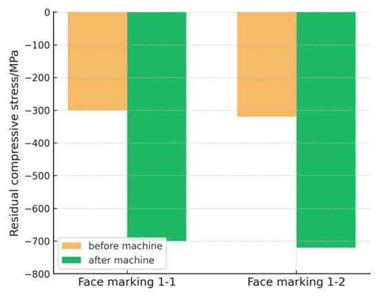 Secondly, the study examined the changes in residual stress of the main bearings before and after processing. The introduction of residual compressive stress during abrasive flow processing helps enhance the fatigue resistance of the material’s surface, contributing to the bearings’ durability under extreme conditions. These experimental results confirm the positive role of abrasive flow processing in improving the long-term operational stability and wear resistance of the main bearings.