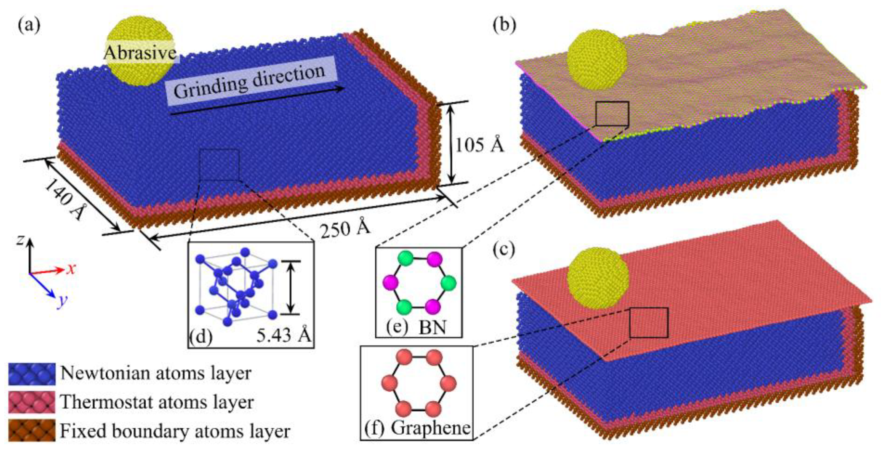 - Dai, H.; Zhang, F.; Zhou, Y. Numerical study of three-body diamond abrasive polishing single crystal Si under graphene lubrication by molecular dynamics simulation. Comput. Mater. Sci. 2020, 171, 109214. [Google Scholar] [CrossRef]