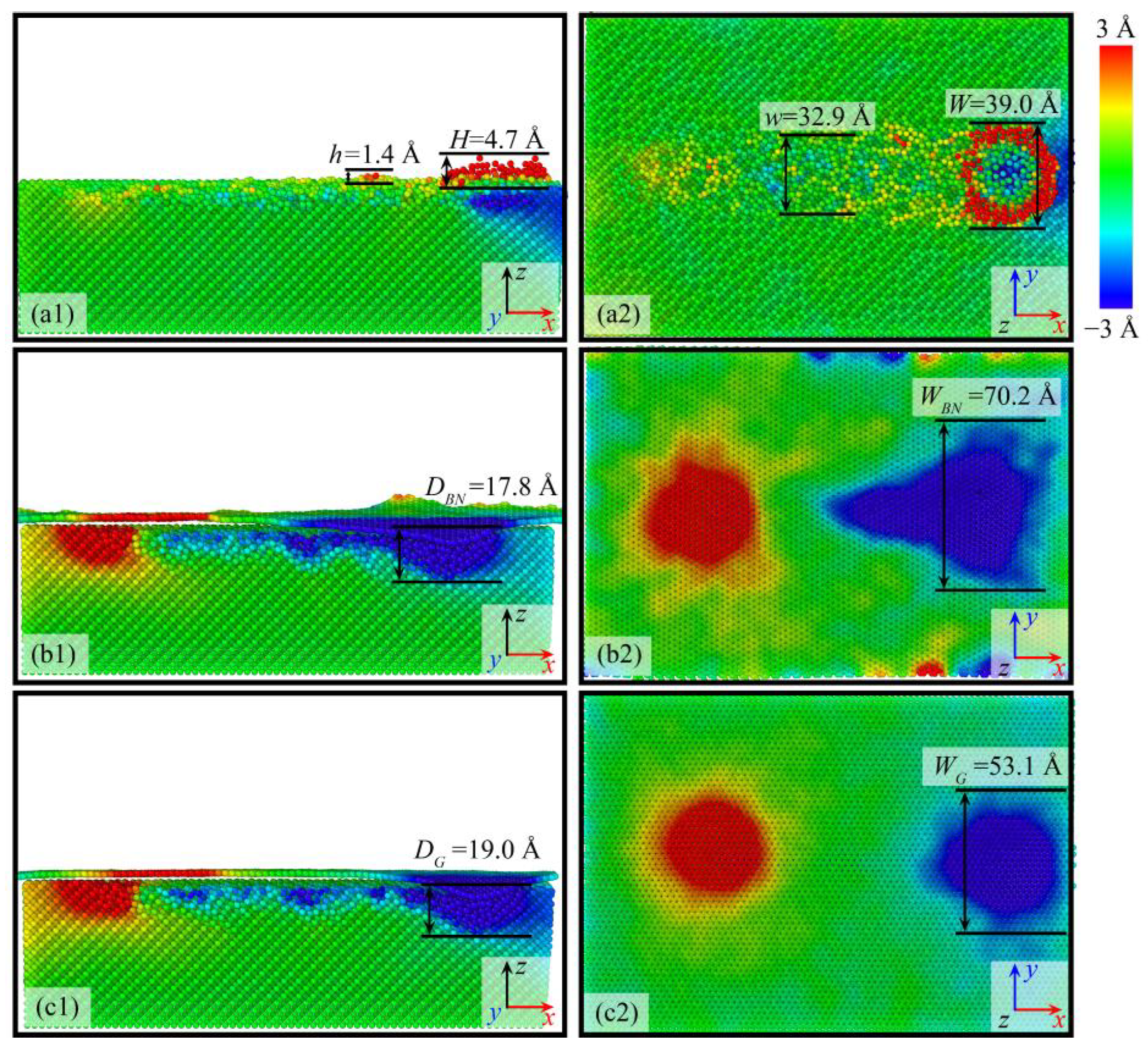 - Different surface film conditions significantly affect machined surface morphology and subsurface damage. Without films, chip formation and groove-end pile-up dominate, whereas BN and graphene films suppress chip formation and promote groove expansion. Graphene provides stronger constraint on atomic displacements, leading to better surface quality.