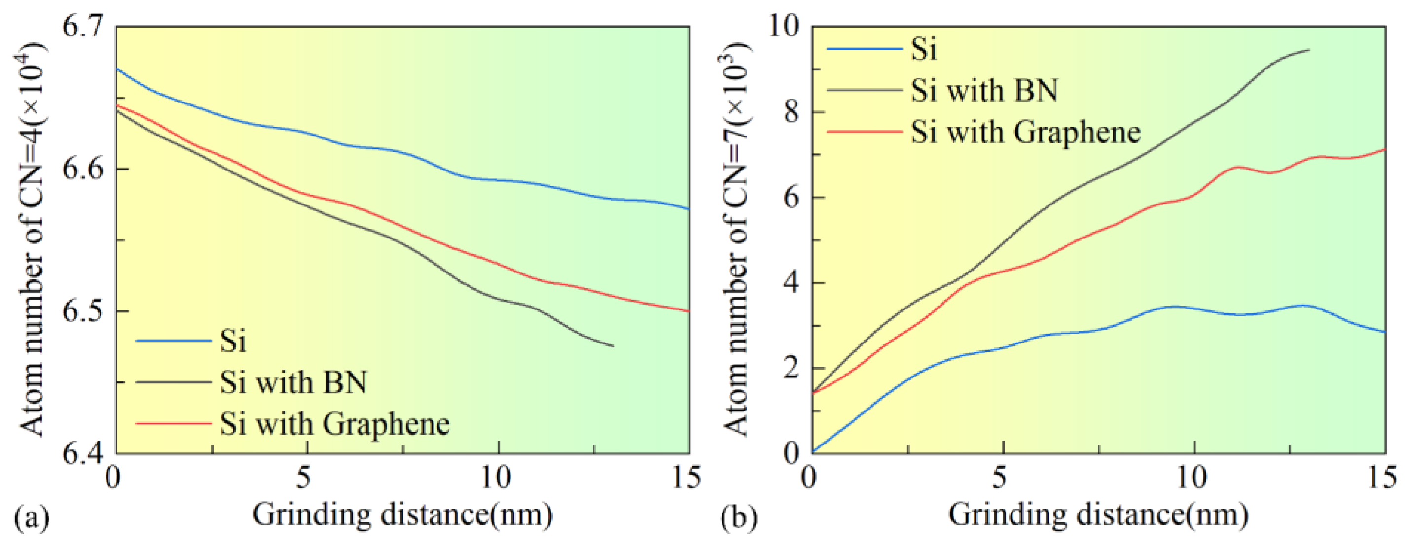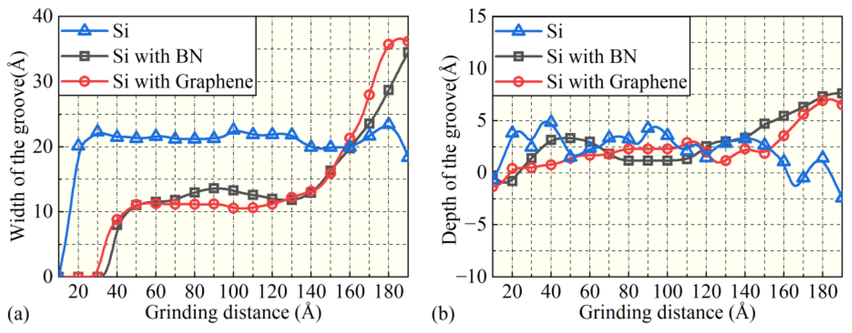 - Uncoated Si workpieces are prone to chip formation and pile-up, favoring high-efficiency material removal. BN films reduce tangential force, friction, and temperature rise, making them suitable for conventional precision nanogrinding. Graphene films, with superior lubrication and heat conduction, perform better in improving surface quality, reducing temperature, and supporting high-speed grinding, but they also lead to higher normal force and more severe subsurface damage.