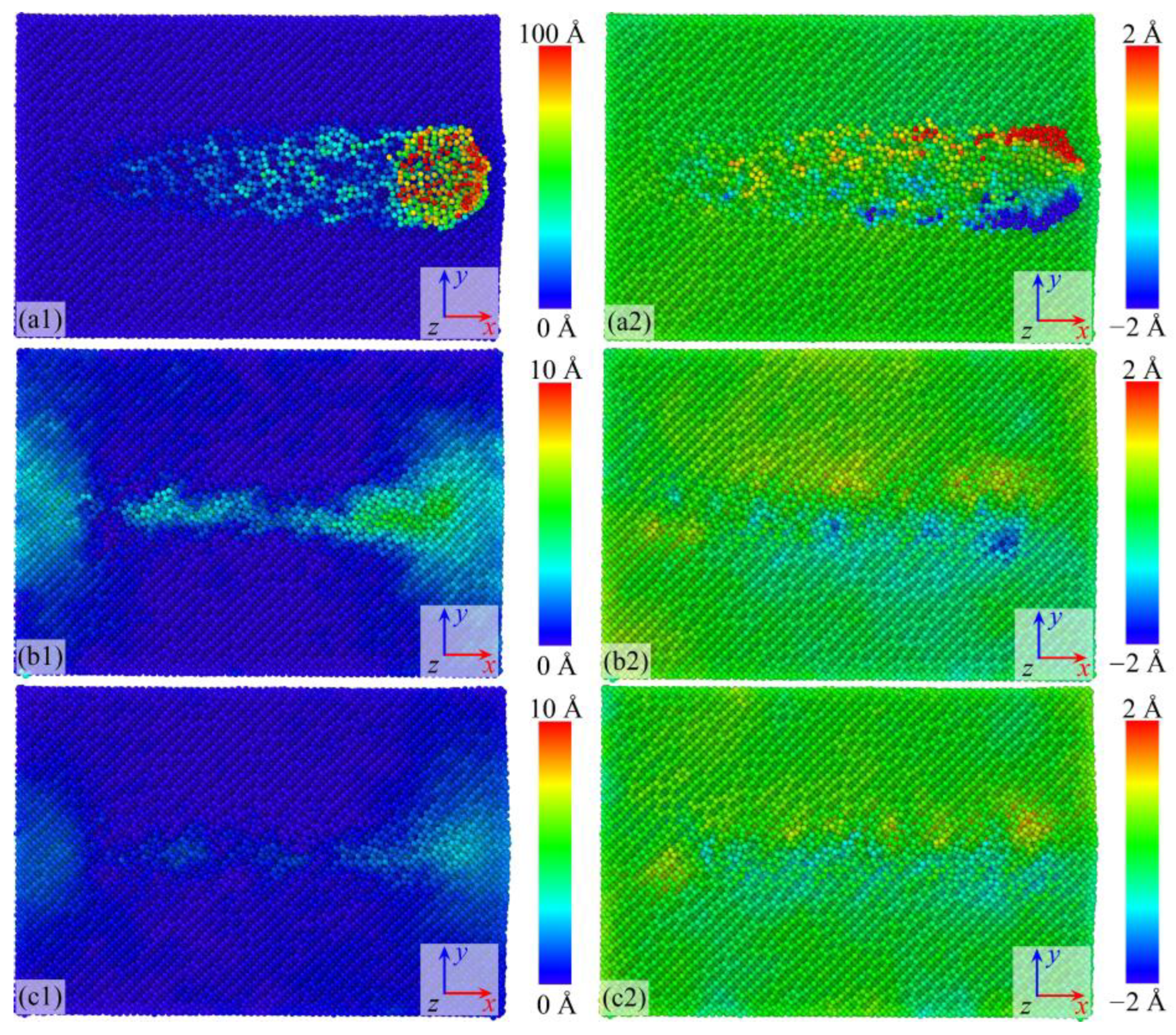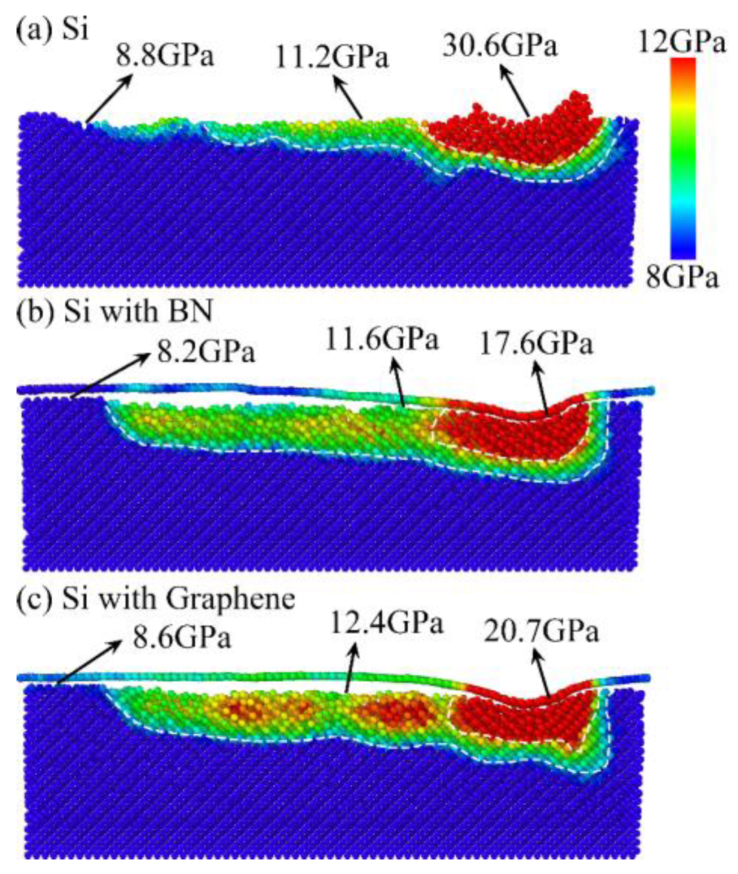- Dai, H.; Li, S.; Chen, G. Molecular dynamics simulation of subsurface damage mechanism during nanoscratching of single crystal silicon. Proc. Inst. Mech. Eng. Part J J. Eng. Tribol. 2019, 233, 61–73. [Google Scholar] [CrossRef]