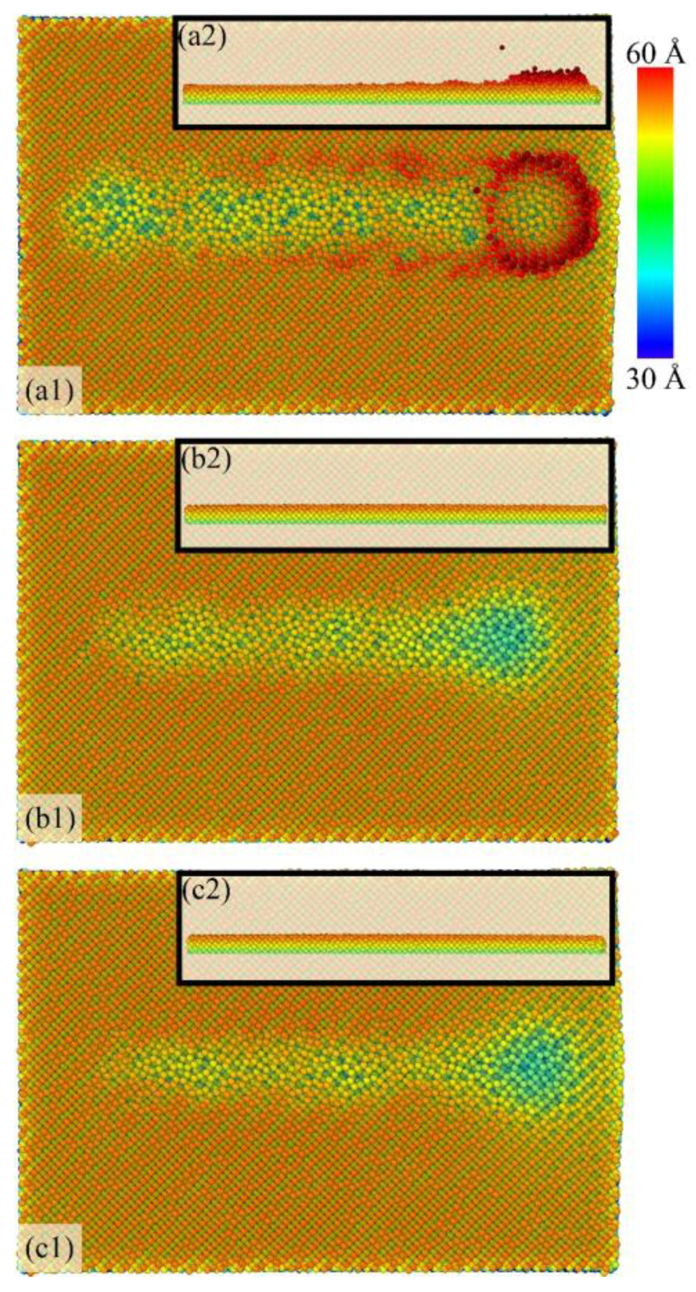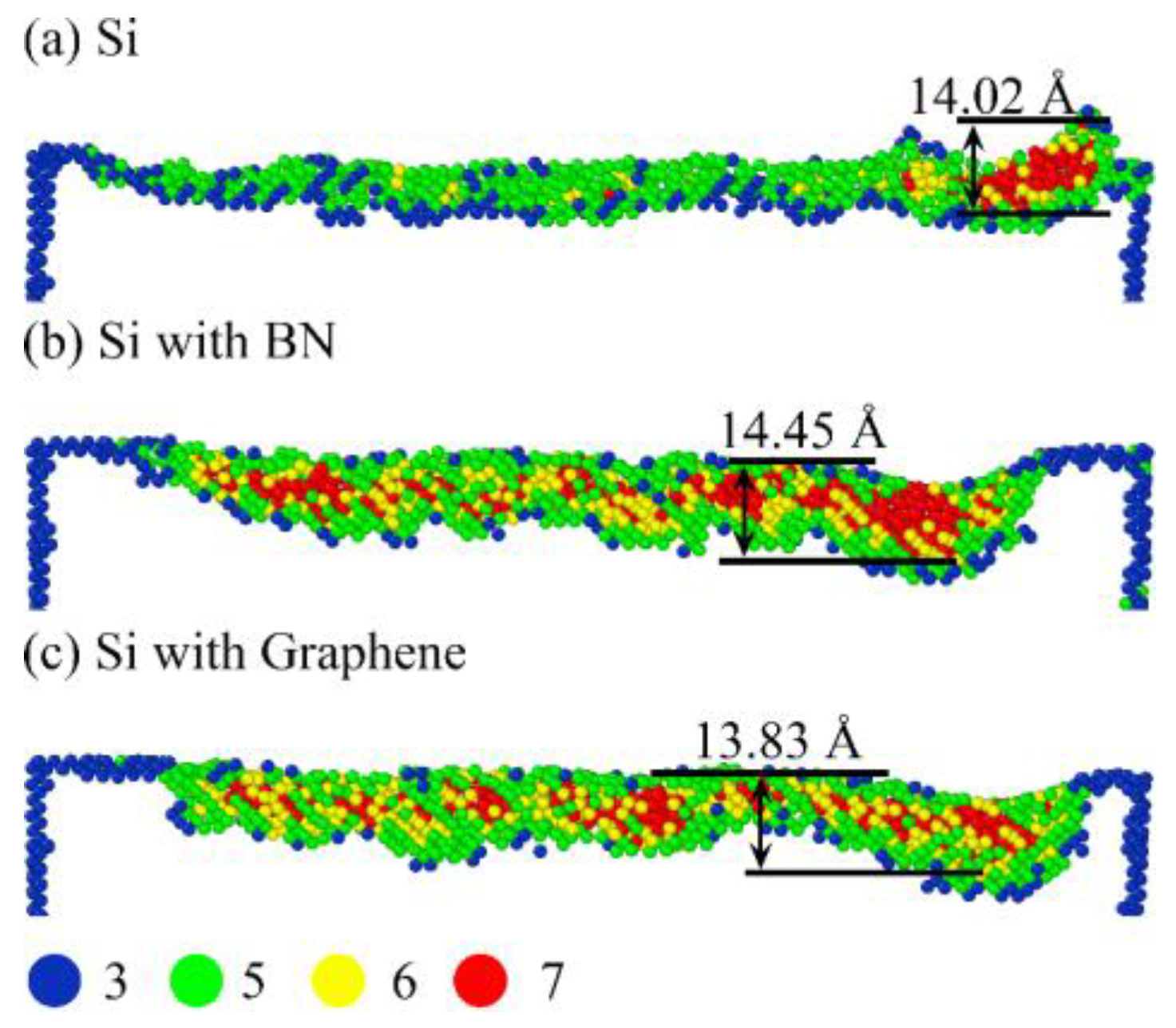 - The presence of surface films increases the SDL thickness by 52.34% (BN)–54.21% (graphene). However, their ability to inhibit phase transformation is limited. By slowing the release of surface pressure, high-coordination atoms (CN = 7) are partially retained, influencing the phase transformation process.