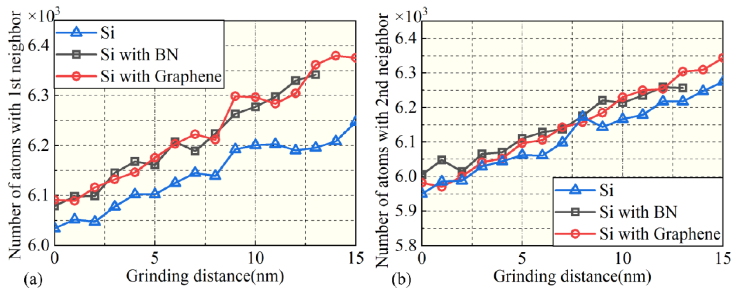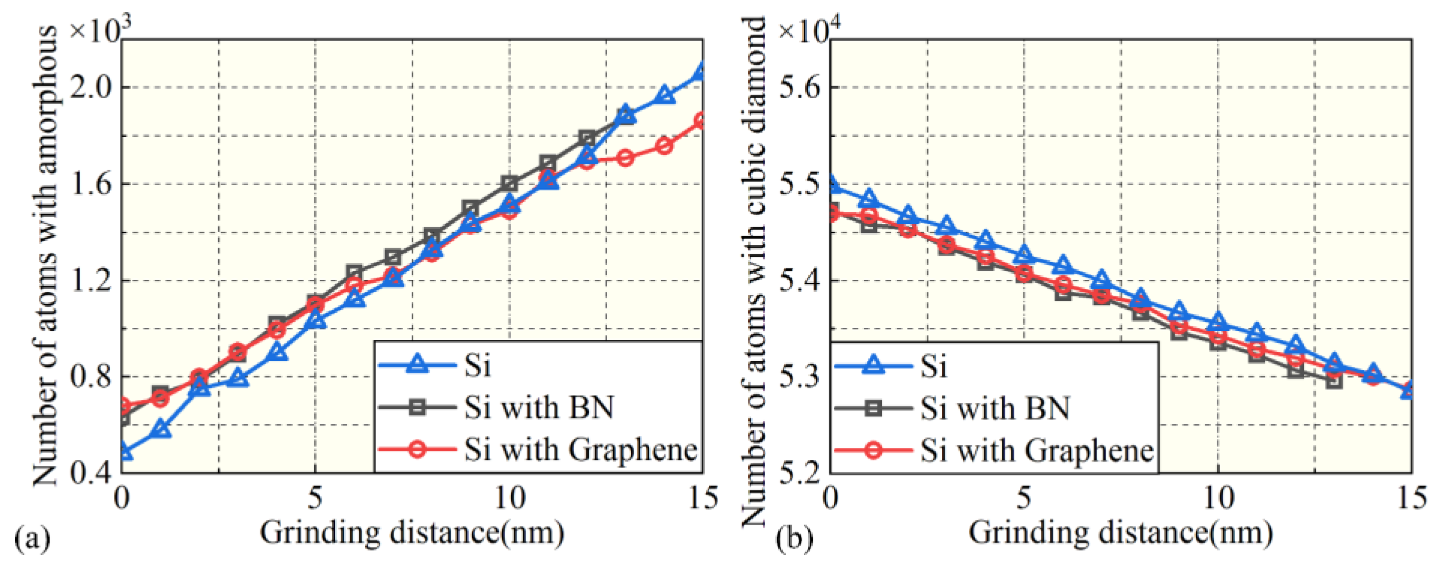 - Both BN and graphene films reduce the average tangential force by 77.64–80.87% while increasing the average normal force by 180.72–273.70%. Graphene shows a stronger suppression of tangential force but a higher increase in normal force. In addition, graphene effectively reduces force fluctuations, making it more suitable for high-speed nanogrinding. The effect of grinding speed on average forces is minimal under film-covered conditions, whereas without a film, higher speeds reduce the average forces.
