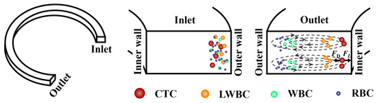 Compared to straight channels, curved channels are dimensionally compact, and have been widely used for the rapid and continuous isolation of viable CTCs. Di Carlo et al. [32,33] demonstrated that the introduction of curvature introduces a secondary cross-sectional flow field perpendicular to the primary flow direction, known as Dean flow. The magnitude of Dean flow is measured using a nondimensional parameter, the Dean number (De) [32]: