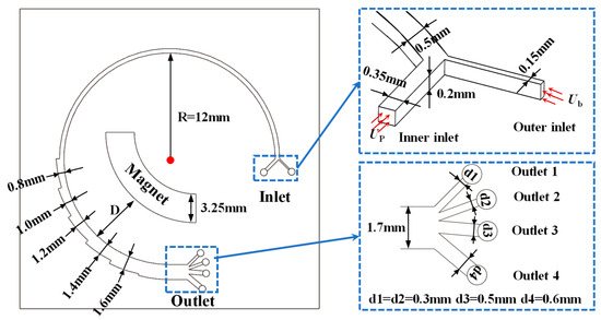 In this study, the separation of CTCs from blood cells is investigated using a novel inertial spiral microchannel coupled with a magnetic field. A schematic of the research microchip is shown in Figure 2. The proposed microchannel consists of two parts, a curved spiral microchannel with a constant width and a curved spiral microchannel with increasing width near the superparamagnetic magnet. The former is used to separate cells with different sizes, and the latter is supplemented to separate cells with similar sizes based on biochemical properties. The incremental size in channel width depends on the balance of the fluidic speed of magnetic separation techniques in microfluidic separation devices and the processing size limit of 3D printing. It has been set as 0.2 mm to obtain a congenial fluidic speed for effective magnetic separation. The curved spiral microchannel part contains two inlets and four outlets. Bloodstream containing CTCs is injected into the microchannel using a pressure controller from the outer inlet. And the inner inlet is used for the injection of Phosphate-Buffered Saline (PBS) to create a tight flow in the vicinity of the outer channel wall. The fundamental microstructures of the curved spiral microchannel with dimensions are illustrated in Figure 2. To comprehensively study the effects of parameters on the performance of the chip, a series of parameters are designed in this article, as shown in Table 1, including the fluid velocity, magnetic field, and particle properties. First, the PBS fluid velocity (Up) is the main parameter affecting the separation of the cells, which is set from 2.5 × 10−8 m3/s to 3.5 × 10−8 m3/s. Second, the magnetic field induced by the superparamagnetic magnet also affects the separation performance for similar cells or particles, which is varied by altering the residual magnetic flux density and the distance between the channel and the magnet. Finally, the separation efficiency of the spiral microchannel for CTCs with different particle size is also examined.
