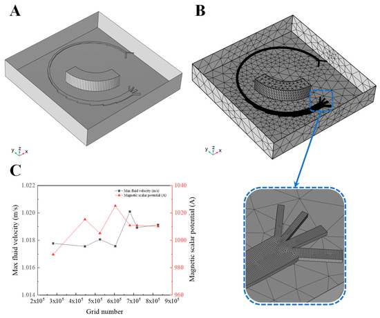 (A) The simplified microchannel and a schematic of the research microchip pre-processing stage. (B) The grid setting of different channel structures. (C) A plot of the velocity and magnetic scalar potential with the increment in grid number to prove mesh convergence.