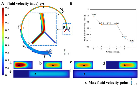 The simulation results of fluid flow. (A) The fluid flow velocity in the microchannel in the x–y direction cross section and the x–z direction cross section, the letters a–f respectively represent the cross-sectional velocity distribution cloud diagrams at different positions. (B) A plot of the max fluid velocity alteration in the channel.