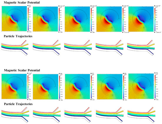 The last factor is the magnetic field, which depends on the remanent flux density of the magnet and its position in the microfluidic chip. In this study, the remanent flux density is set in the range of 1.08–1.28 T, based on the properties of the commonly used magnet. As seen in Figure 7, the magnetic scalar potential is significant increased with increasing remanent flux density. With the increasing magnetic force, the CTCs, which are assumed to possess magnetic properties, are driven to a position closer to the magnet in Outlet 1. A portion of CTCs tend to adhere on the inner wall of Outlet 1 when the magnetic scalar potential reaches 1.12 × 103 owing to the increase in magnetic force. The settled positions of the magnet are chosen on the inside of the microfluidic chip, and the linear distance from the center (Dc) is selected as 2.5–4 mm to induce various magnetic fields. As seen in Figure 7, the range and value of the magnetic scalar potential both vary when reducing the distance between the magnet and the microchannel. Compared with the remanent flux density, the effect of magnet position on CTC sorting is more complex. Adjusting the position of the magnet not only changes the outflow position of CTCs in Outlet 1, but also significantly affects the distribution of other cells at different outlets. As Dc increases, a greater number of RBCs tend to exit through Outlet 1, and the separation purity of cells at each outlet is enhanced.