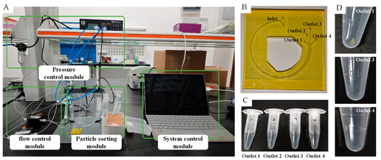 To evaluate the availability of this microfluidic chip for clinical application, the experiments have been carried out based on a separating system. This system consists of four significant modules (e.g., pressure control module, flow control module, particle sorting module, and system control module), as shown in Figure 9. The crucial equipment of the particle sorting module is an ideal microfluidic chip fabricated by precise 3D printing technology whose machining accuracy is better than ±25 microns. Four distinct microspheres with different diameters and fluorescence characteristics have been used in separating experiments. They are red polystyrene microspheres with a diameter of 5 µm, blue polystyrene microspheres with a diameter of 14 µm, green polystyrene microspheres with a diameter of 20 µm, and yellow fluorescent carboxyl magnetic microspheres with a diameter in the range of 18–24.9 µm. The last one is assumed as CTCs with magnetization treatment when other microspheres are assumed as blood cells.