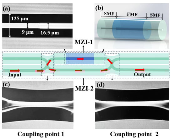 Figure 2a presents a schematic diagram of the optical path transmission in the MTP-MZI. When incident light travels through an SMF, it is split into two beams at coupling point 1. The path containing the MZI-1 structure is designated as the sensing path, while the other is the reference path. As the light enters the MZI-1 structure, it functions as an IMZI. Due to the mismatch in mode field diameters between the SMF and the FMF, the core fundamental mode light is excited, resulting in a part of light propagating in the cladding. These lights exist in both cladding and core as the cladding mode and core fundamental mode. When the FMF is fused with the SMF, the light traveling through the different paths generates interference. In the MZI-2 structure, the transmitted light is still predominantly governed by the core fundamental mode. When the light from the sensing path and the reference path converges at coupling point 2, interference occurs due to the differences in the transmission paths of the two beams.