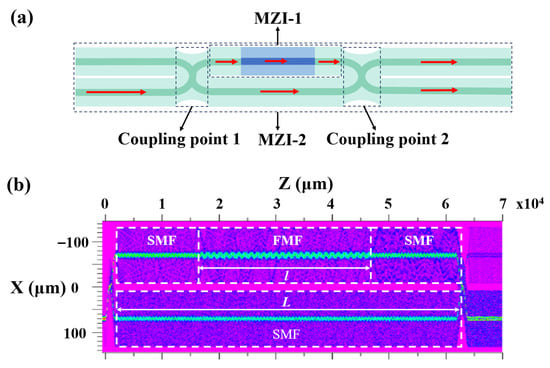 To analyze the light distribution more effectively, we utilized the beam propagation method to simulate the MTP-MZI structure. The step-index FMF transmits the modes of LP01, LP11, LP21, and LP02, and with effective mode field areas of 190 μm2, 181 μm2, 201 μm2, and 182 μm2, respectively. The light field simulation diagram is shown in Figure 2b. In this figure, the MTP-MZI includes two coupling points used for beam splitting and coupling. The light splits at the splitting point and propagates along two distinct paths, and the light from both paths interferes at coupling point 2. As illustrated in Figure 2b, the sensing path exhibits oscillations in the light field distribution due to the fusion splicing of the FMF. This results in the excitation of high-order modes, which enables high-sensitivity environmental detection. The FMF length and the spacing between the coupling points are denoted as l and L, respectively. These parameters jointly determine the coupling ratio of light entering the two optical paths and the free spectral range of the interference spectra.