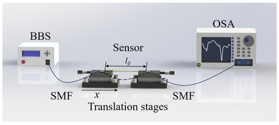 Figure 4 illustrates the experimental manufacturing schematic of the sensor for curvature detection. Both ends of the sensor are connected to BBS and OSA respectively for spectral observation. The sensor is fixed at both ends on two displacement platforms, maintaining a room temperature of 25 °C. By adjusting the distance between the left displacement platform and the right platform, the curvature of the sensor can be altered. It can be seen from the following equation: