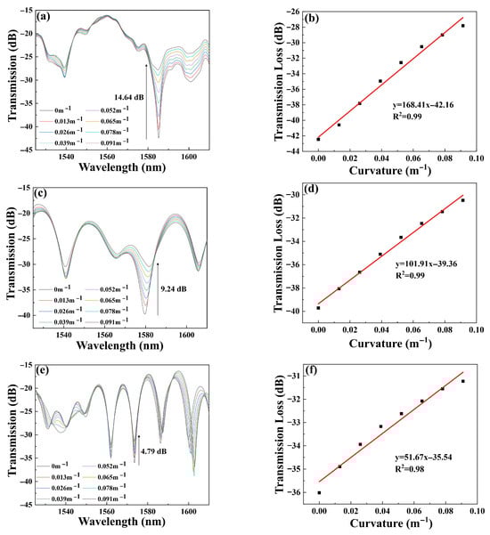 Figure 5a displays the transmission spectra of Sensor 1 at varying curvatures. Near 1580 nm, the intensity of the transmission spectra increases with changes in curvature. As the curvature gradually increases from 0 m−1 to 0.091 m−1, the intensity rises from −42.45 dB to −27.81 dB, resulting in a total increment of 14.64 dB. Furthermore, through the linear fitting of curvature and transmitted light intensity in Figure 5b, we conclude that the curvature sensitivity of Sensor 1 is 168.41 dB/m−1, with a linearity (R2) of 99.2%. This curvature sensitivity is currently the highest among the sensors tested, making Sensor 1 particularly valuable for curvature measurements and monitoring. Figure 5c presents the transmission spectra of Sensor 2. As the curvature changes from 0 m−1 to 0.091 m−1, the intensity alters from −39.72 dB to −30.48 dB, with a total increment of 9.24 dB. We can see from Figure 5d that the fitting curve for Sensor 2 indicates that the intensity curvature sensitivity is 101.91 dB/m−1, with an R2 of 99%. Figure 5e shows the transmission feature of Sensor 3 in the curvature detection. It is observed that when the curvature gradually increases from 0 m−1 to 0.091 m−1, the intensity rises from −36.01 dB to −31.22 dB, leading to a total increment of 4.79 dB. In Figure 5f, the curvature sensitivity and R2 for Sensor 3 are 51.67 dB/m−1 and 98%, respectively.