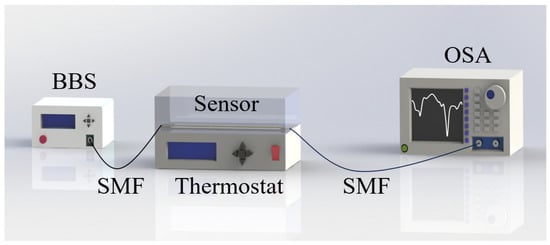 To ensure the reliability of the sensor in practical applications, it is essential to analyze its temperature characteristics. As part of our research, we conducted a thorough examination of the sensor’s temperature behavior. Figure 6 presents a schematic diagram of the temperature-sensing equipment used in our experiments. The sensor was placed in a thermostat, with one end connected to a BBS and the other end connected to an OSA. Notably, we maintained a stable curvature state of the sensor throughout the temperature detection process. Initially, we set the thermostat to 65 °C and gradually lowered the temperature to 30 °C. At each stable temperature point, we recorded the sensor data and allowed the system to stabilize for 10 min to ensure accurate temperature readings. Furthermore, we documented the data at intervals of 5 °C to gather comprehensive information regarding the sensor’s temperature characteristics.
