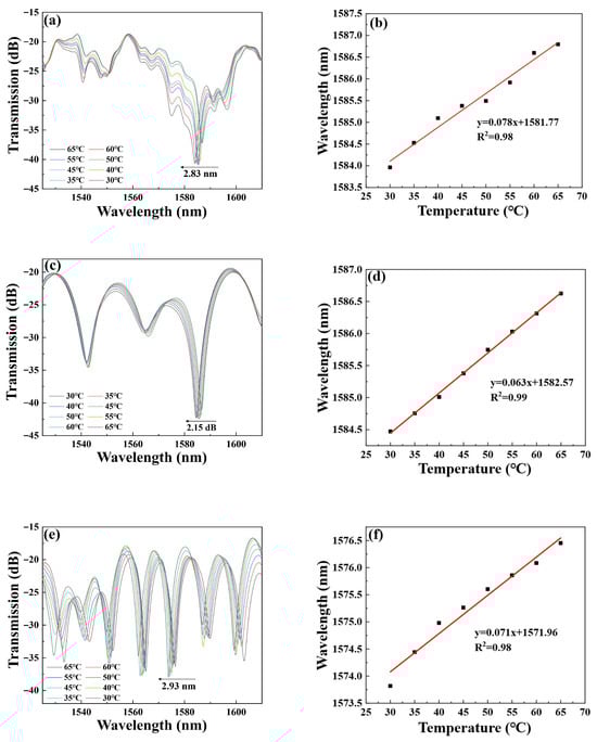 Temperature transmission spectra of (a) Sensor 1; (c) Sensor 2; (e) Sensor 3. Fitting curve of (b) Sensor 1; (d) Sensor 2, (f) Sensor 3.