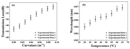 To illustrate the stability and repeatability of the proposed sensor with curvature and temperature, we further analyze the spectral response of Sensor 1 when the curvature and temperature change back and forth three times, as shown in Figure 8. We can see that the transmission spectra only have a slight fluctuation when the curvature/temperature changes, which proves that the proposed sensor has excellent curvature/temperature stability, and can provide a practical application due to its reliable performance.