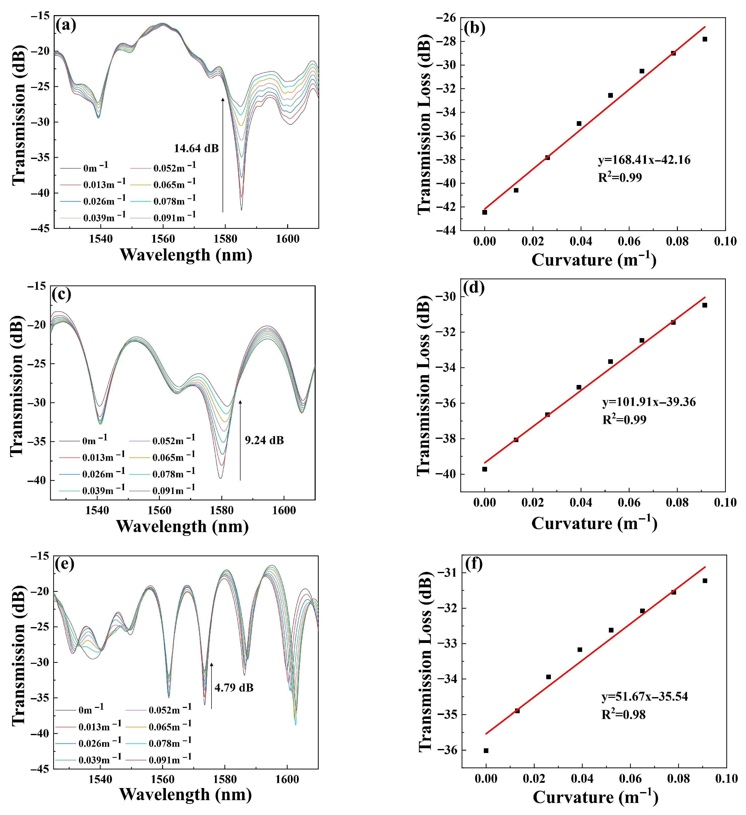 Structure | Curvature Sensitivity (dB/m−1) | Extinction Ratio (dB) | Curvature Range | Temperature Sensitivity (pm/°C) | Reference |
