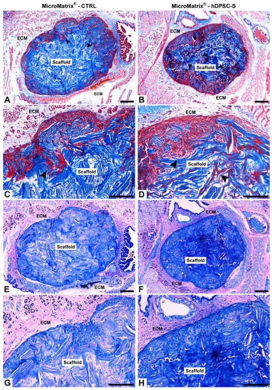 Integration of MicroMatrix® scaffold into leech tissues. Masson’s Trichrome (A–D) and May-Grünwald Giemsa (E–H) staining show the integration of both CTRL and hDPSC-S scaffolds into the leech body wall. In CTRL (A,C), cell colonization (black arrowheads) is superficial, whereas in MicroMatrix®-hDPSC-S (B,D), deeper infiltration is observed. Giemsa staining confirms these findings for both CTRL (E,G) and MicroMatrix®-hDPSC-S (F,H), with the latter displaying a more intense blue, indicating higher cell infiltration. ECM: extracellular matrix. Bars in (A,B,E,F): 100 µm; bars in (C,D,G,H): 50 µm.