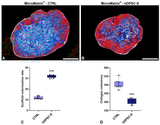 MicroMatrix® cellular colonization rate and collagen fibers spatial organization. Image-based analyses conduced on Masson’s Trichrome staining (A,B) reveal deeper and more homogeneous infiltration in MicroMatrix®-hDPSC-S, as indicated by the expanded red-stained region and also confirmed by the quantitative analyses presented in the graph (C). In addition, a reduced collagen fibers coherency is detectable in hDPSC-S-supplemented scaffold (D), suggesting that infiltrated cells actively remodel the inner matrix. Statistical significance between CTRL and MicroMatrix®-hDPSC-S samples was calculated using Student’s t-test, and bars represent mean ± standard deviation (SD). *** p < 0.001. Bars in (A,B): 100 µm.