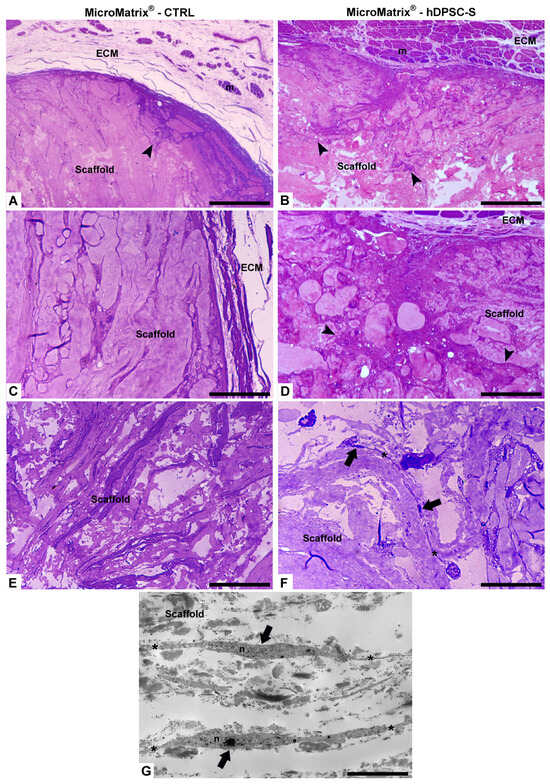 Morphological analyses by optical and TEM microscopy. Compared to CTRL (A,C,E), a more homogeneous cellular infiltration is visible in MicroMatrix®-hDPSC-S (B,D,F), where collagen fibers appear looser and less compact, indicating active ECM remodelling and cellular penetration (black arrowheads). Telocytes (black arrows in (F,G)) are characterized by small cell bodies and long telopodes (*). ECM: extracellular matrix; m: muscles fibers; n: nucleus. Bars in (A–F): 100 µm; bar in (G): 5 µm.