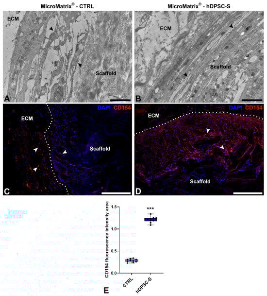 Characterization of cell populations in MicroMatrix®. TEM images (A,B) reveal elongated vasocentral cells (black arrowheads) with electron-dense cytoplasm located outside the scaffold. These cells are more compact and aligned in the MicroMatrix®-hDPSC-S sample (B) compared to CTRL (A). Immunofluorescence staining (C,D) indicates a higher CD154+ signal (white arrowheads) in MicroMatrix®-hDPSC-S (D), as demonstrated by the fluorescence intensity graph (E). Dashed lines in (C,D) delineate the boundaries between scaffold and ECM. Statistical significance between CTRL and MicroMatrix®-hDPSC-S was calculated using Student’s t-test, and bars represent mean ± standard deviation (SD). *** p < 0.001. ECM: extracellular matrix. Bars in (A,B): 10 µm; bars in (C,D): 50 µm.