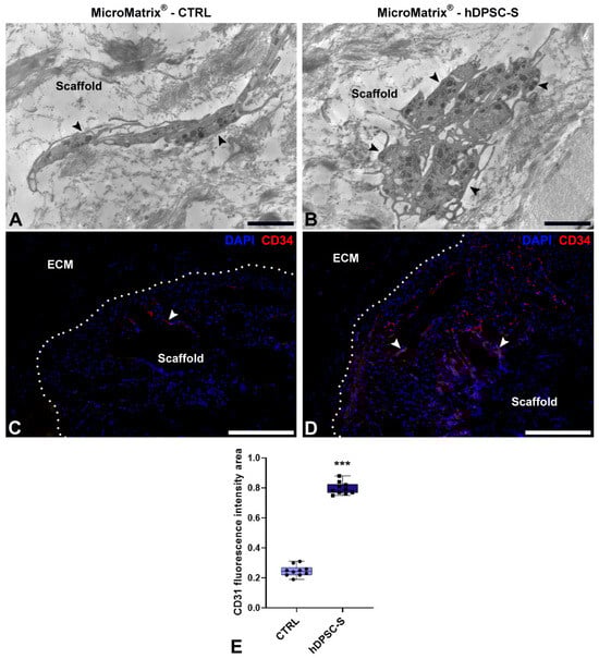 Hematopoietic Stem Precursor Cells (HSPCs) recruitment in MicroMatrix®. Compared to CTRL (A), TEM analyses reveal numerous HSPCs (black arrowheads) within the MicroMatrix®-hDPSC-S (B). Immunofluorescence assays (C,D) confirm this result, showing a marked increase in CD34+ cells (white arrowheads). Dashed lines in (C,D) delineate the boundaries between scaffold and ECM. Quantification of the CD34 signal (E) validates this result. Statistical significance between CTRL and MicroMatrix®-hDPSC-S samples was calculated using Student’s t-test, and bars represent mean ± standard deviation (SD). *** p < 0.001. ECM: extracellular matrix. Bars in (A,B): 10 µm; bars in (C,D): 50 µm.