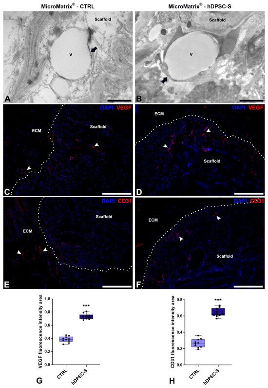 Pro-angiogenic effects of hDPSC-S in MicroMatrix®. TEM analyses (A,B) reveal the presence of newly formed blood vessels (black arrows) in both CTRL (A) and MicroMatrix®-hDPSC-S (B). Vessels in the MicroMatrix®-hDPSC-S display a more advanced maturation stage, with a continuous endothelium and well-organized ECM. Immunofluorescence staining (C–F) shows higher signals for both VEGF and CD31 (white arrowheads) in MicroMatrix®-hDPSC-S (D,F) than in CTRL (C,E), as demonstrated by quantitative analyses (G,H). Dashed lines in C–F delineate the boundaries between scaffold and ECM. Statistical significance between CTRL and MicroMatrix®-hDPSC-S was calculated using Student’s t-test, and bars represent mean ± standard deviation (SD). *** p < 0.001. ECM: extracellular matrix. Bars in (A,B): 10 µm; bars in (C–F): 50 µm.