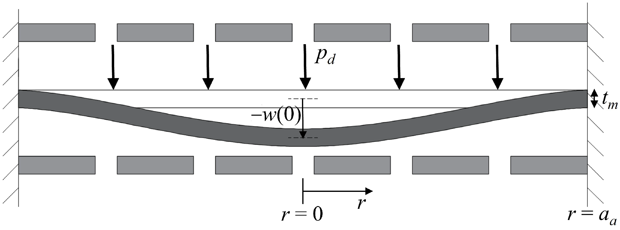 - Sheplak, M. Large deflections of clamped circular plates under initial tension and transitions to membrane behavior. J. Appl. Mech. 1997, 64, 861–869. [Google Scholar] [CrossRef]
