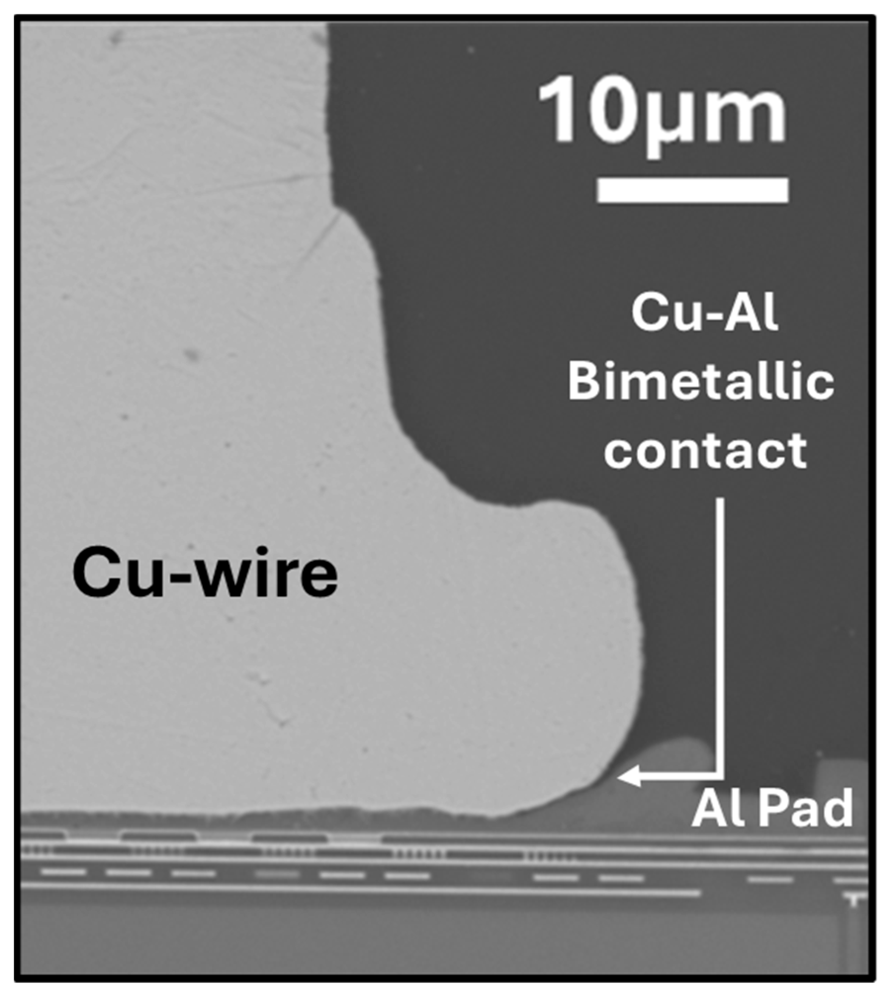 - Osenbach, J.; Wang, B.Q.; Emerich, S.; DeLucca, J.; Meng, D. Corrosion of the Cu/Al Interface in Cu-Wire-Bonded Integrated Circuits. In Proceedings of the 2013 IEEE 63rd Electronic Components and Technology Conference (ECTC), Las Vegas, NV, USA, 28–31 May 2013; IEEE: New York, NY, USA, 2013. [Google Scholar] [CrossRef]